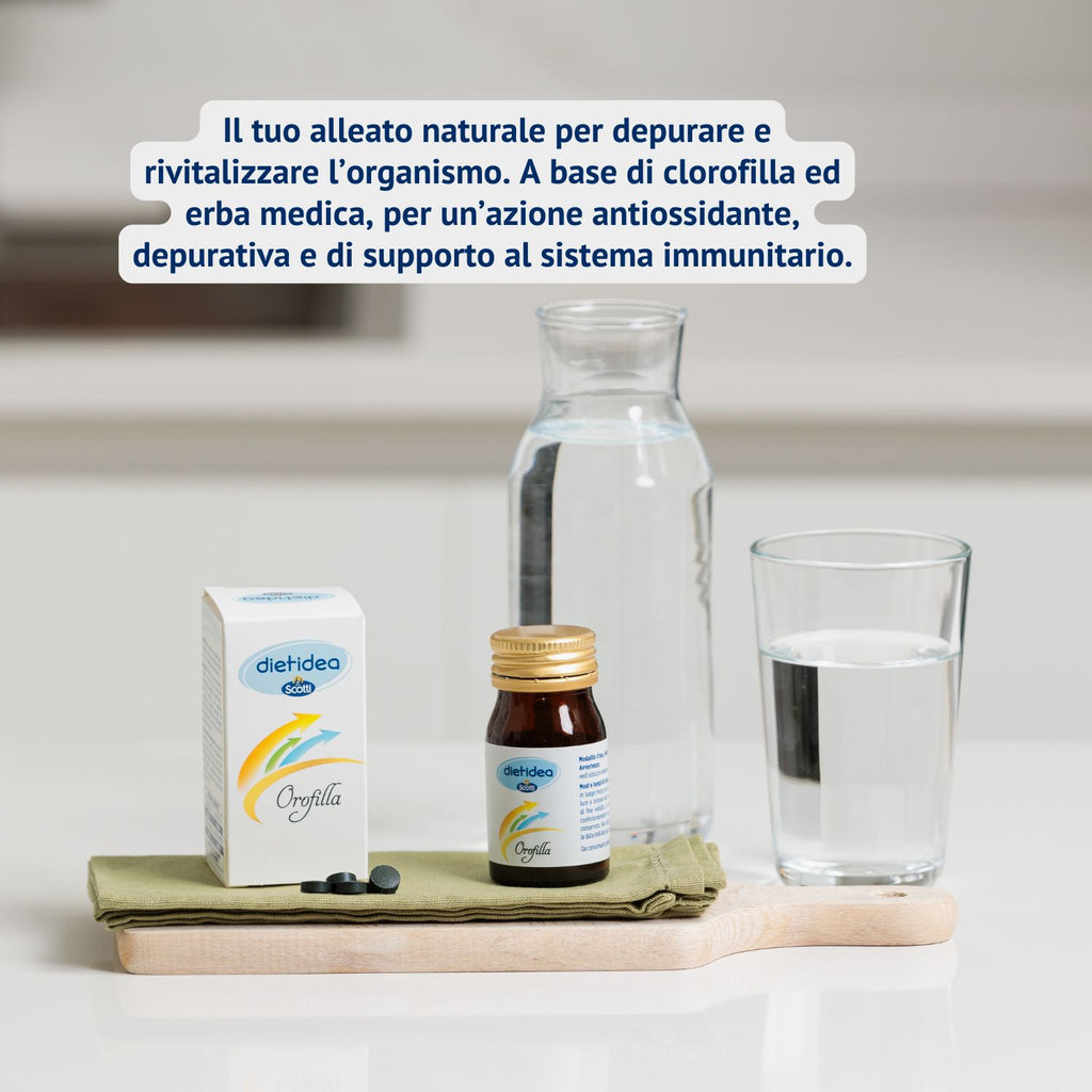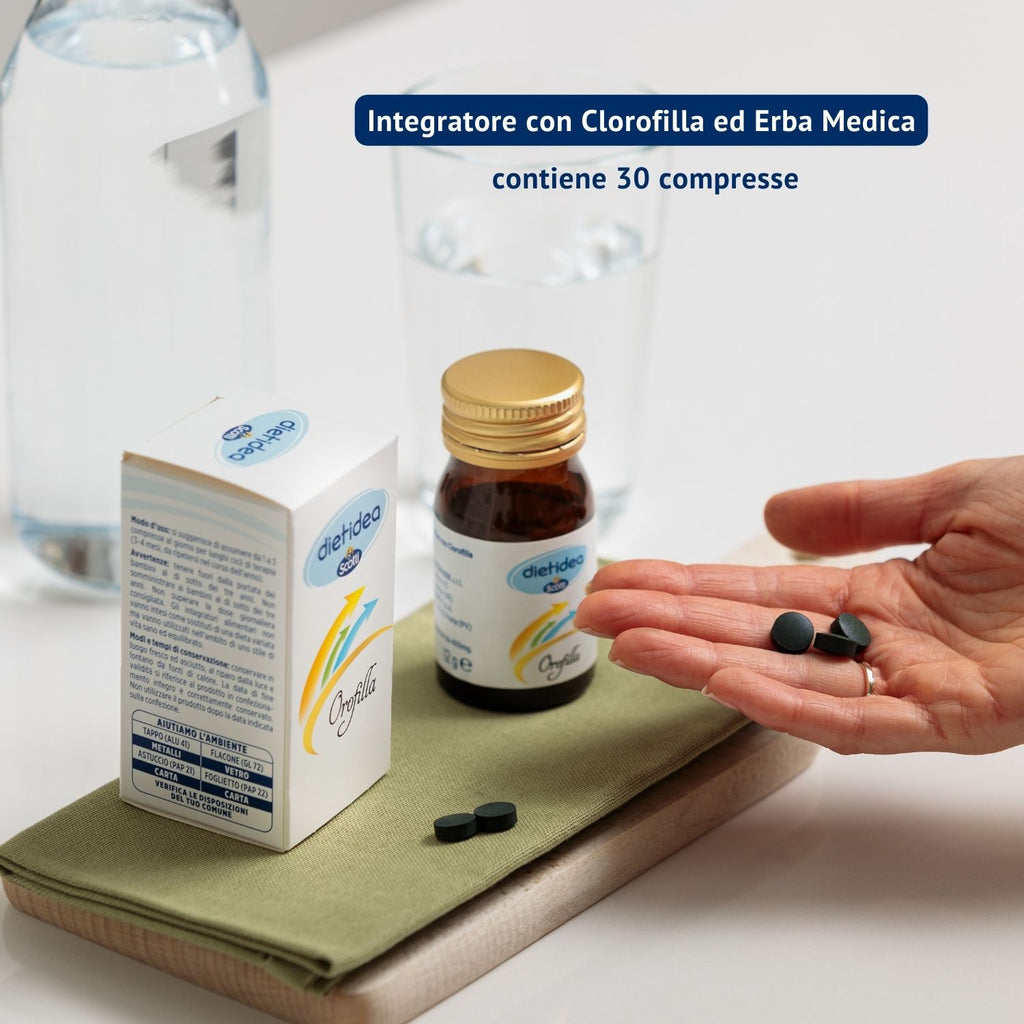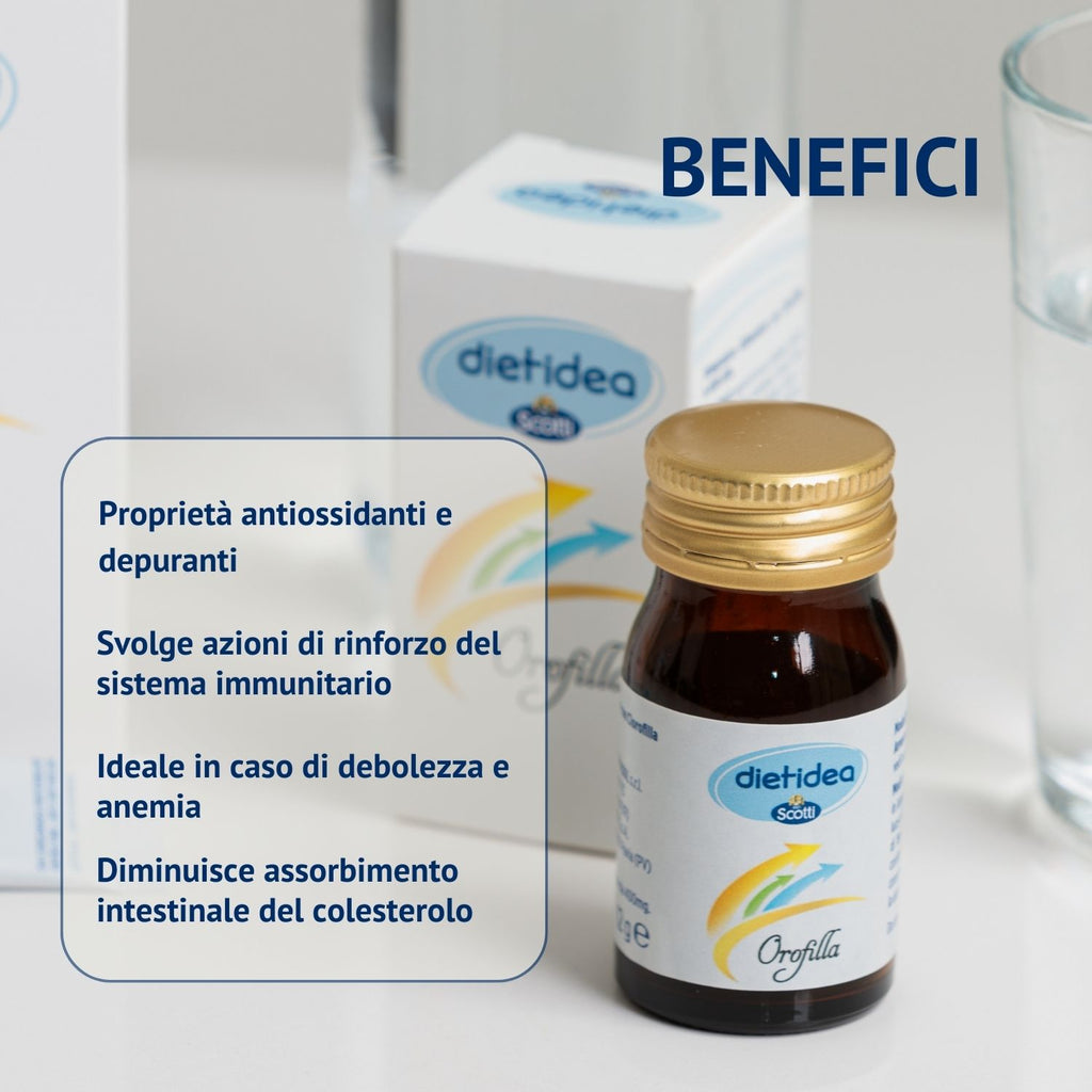 Orofilla è un integratore a base di clorofilla, un pigmento vegetale con struttura chimica del tutto affine a quella dell’emoglobina. Al suo interno è presente anche l’erba medica, o anche detta “alfa alfa”, una leguminosa erbacea perenne ricca di minerali e vitamine, come ad esempio vit. A, vit. B1, vit. B6, vit. C, vit. E, vit. K, niacina, biotina, acido folico, calcio, potassio, fosforo, magnesio, ferro e zinco.