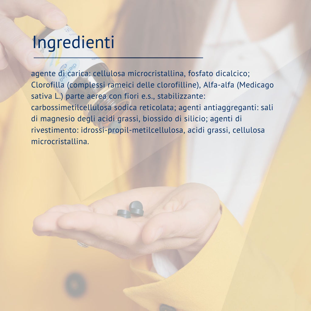 Ingredienti: Agente di carica: Cellulosa microcristallina. Clorofilla rameica, Alfa Alfa (Medicago sativa L. herba c. floribus) e.s. E/D:1/4. Antiagglomeranti: biossido di silicio, magnesio stearato