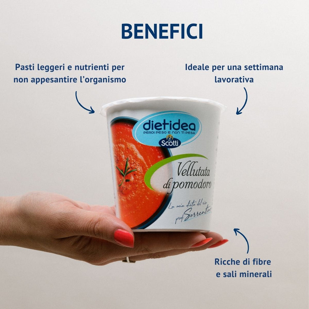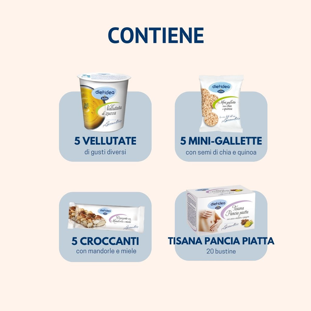 Contiene vellutate di verdure, gustosissime gallette di riso e semi, golosi croccanti alle mandorle e miele per la merenda e la tisana pancia piatta per restare idratati. È ideale per una settimana lavorativa.