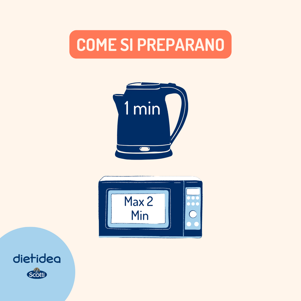 ACQUA BOLLENTE: apri la confezione e versa acqua bollente fino alla tacca interna, mescola bene finchè il contenuto della cup non sarà completamente diluito, aspetta 1 minuto prima di consumare. MICROONDE apri la confezione e versa acqua fredda fino al livello della tacca interna, mescola bene, poni nel microonde la cup e cuoci per 2 minuti a 700 Watt, mescola nuovamente, attendi un paio di minuti prima di consumare poichè il contenuto della cup potrebbe essere bollente. Le condizioni di preparazione potrebbero variare in funzione della temperatura dell'acqua o del tipo di microonde.